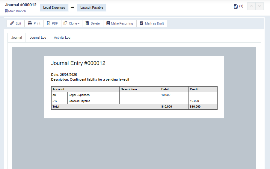 - Streamlined Journal Entries: For probable liabilities, you can easily record expenses and create liability accounts (e.g., Lawsuit Payable) directly within Enerpize’s accounting module..